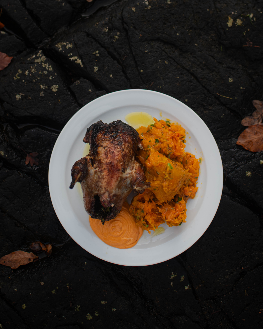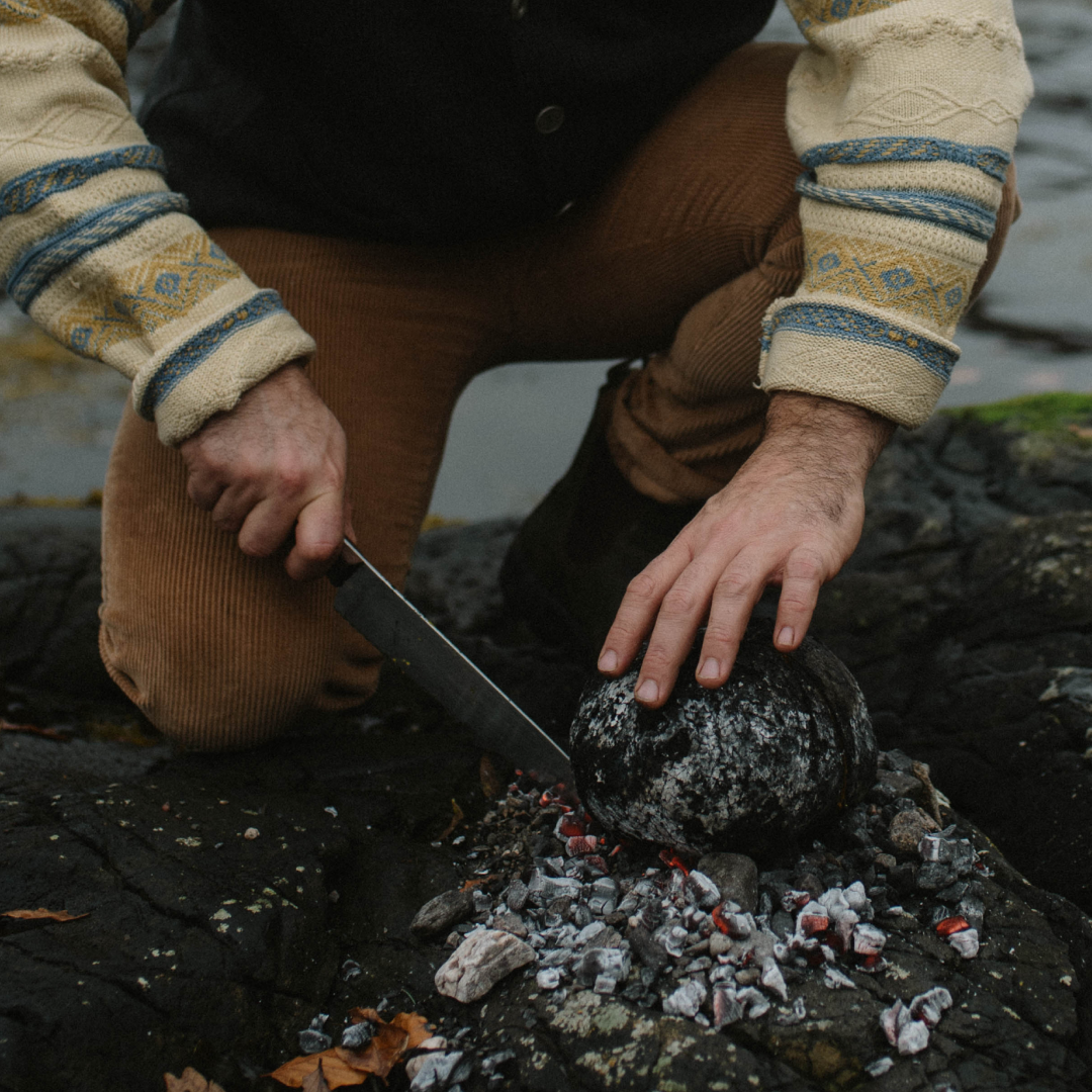 Prepare the fire by building it up and letting it burn down to a bed of large, glowing embers. Use a shovel to form a circle of embers and place the pumpkin in the center. And don't worry if you're cooking in your home kitchen, you can roast the pumpkin in an oven. While the pumpkin is cooking prepare the partridge. To serve, drizzle the pumpkin mixture with rapeseed oil and serve alongside the partridge with a dollop of harissa aioli.