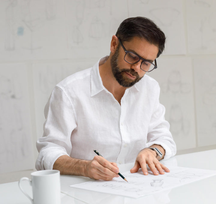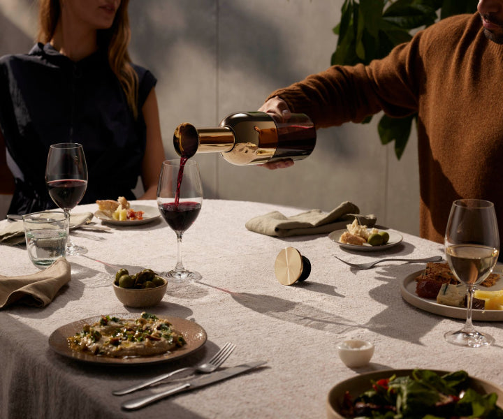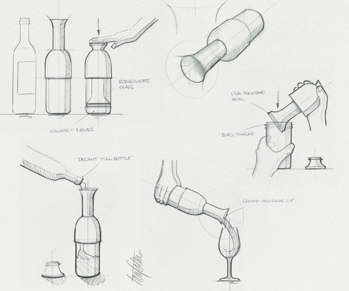 Tom’s early inspiration for ETO was discovering that wine experts routinely transfer leftover wine into a smaller container to minimise air contact. His vision began as a carafe that displaced air, and this grew into a eureka moment when he sketched a design that brought together decanting, pouring and preserving with elegance.